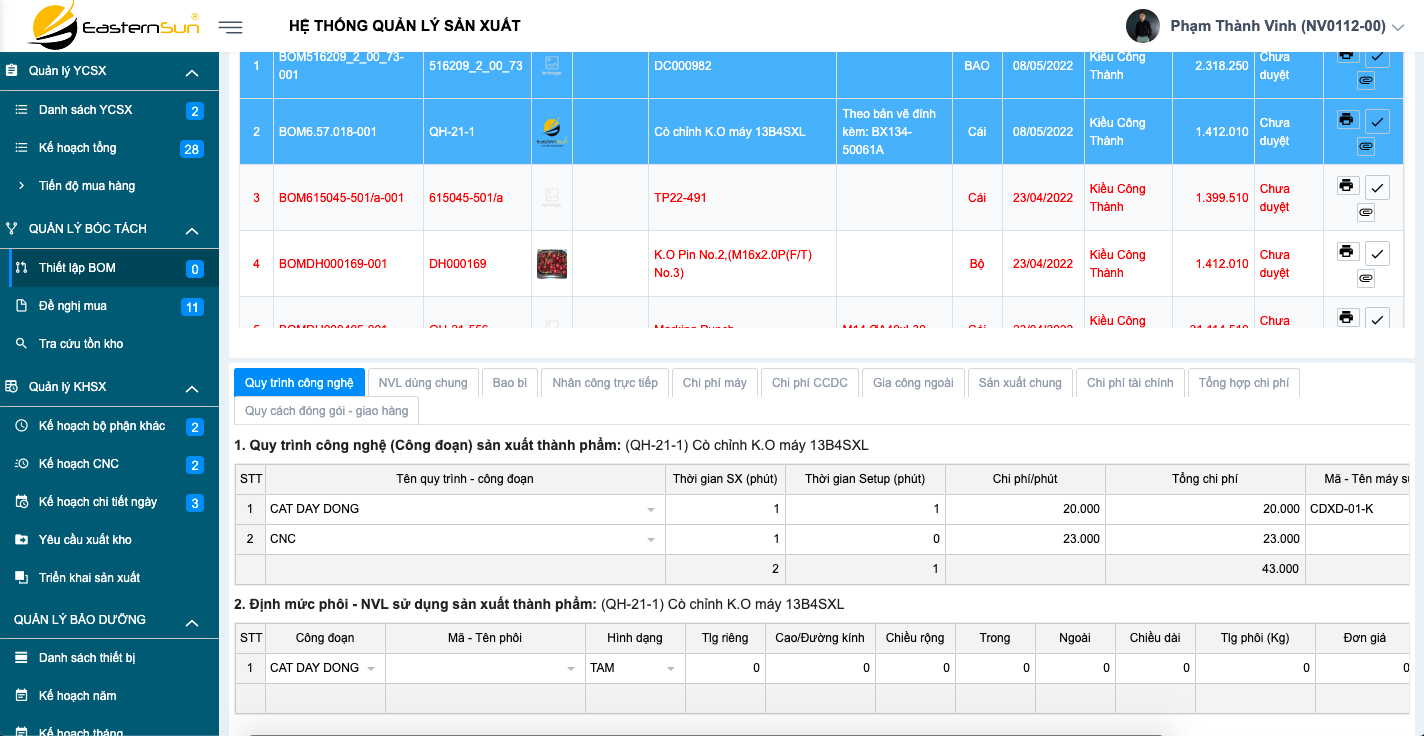 Eastern Sun ERP hỗ trợ bộ phận sản xuất thiết lập BOM chi tiết trên hệ thống. Bộ phận sản xuất có thể lên kế hoạch tổng, kế hoạch ngày dựa.