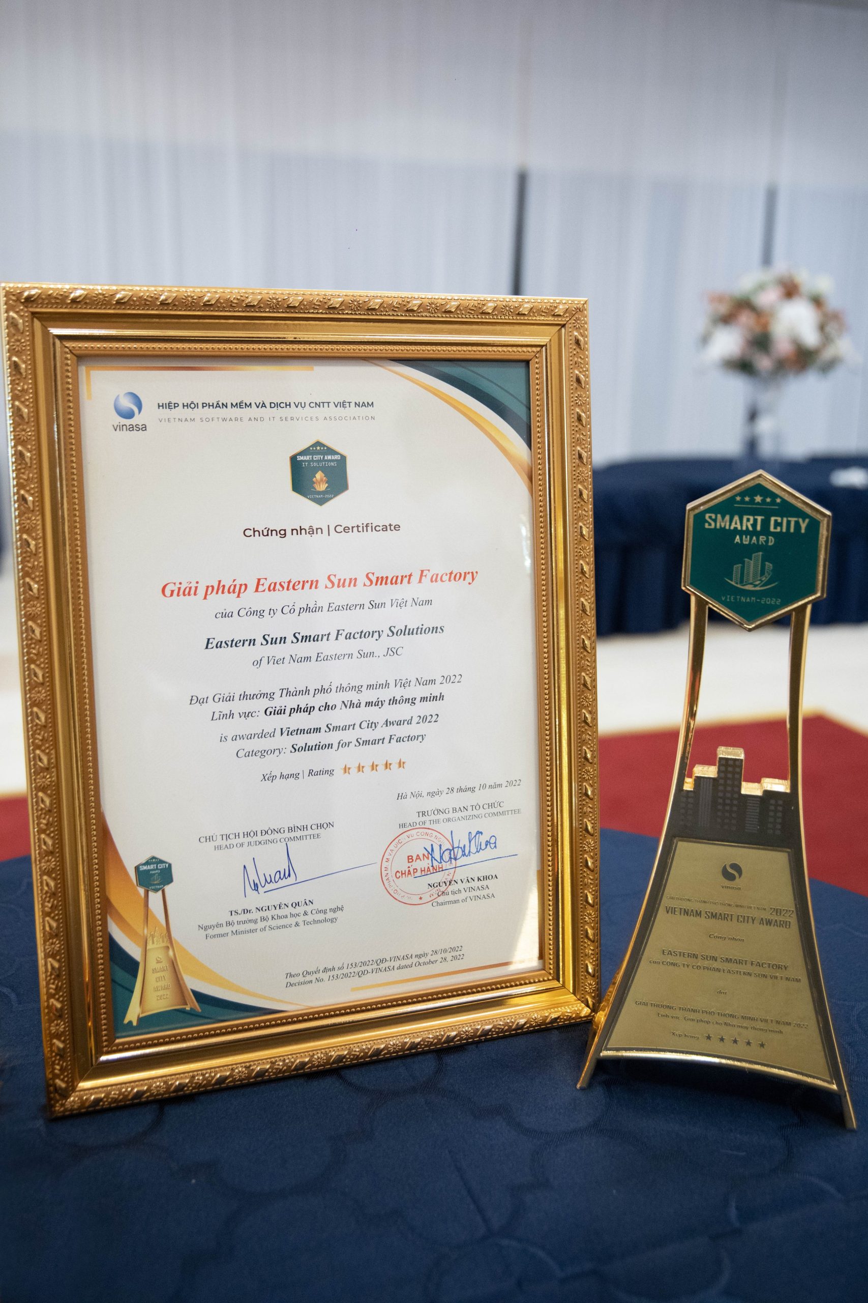 Ngày 28/10/2022, Hội đồng bình chọn Chung tuyển “Giải thưởng Thành phố thông minh Việt Nam 2022” do Tiến sĩ Nguyễn Quân, Nguyên Bộ trưởng Bộ Khoa học và Công nghệ làm Chủ tịch, cùng 18 thành viên đã họp tại Hà Nội. Trên cơ sở báo cáo kết quả đánh giá vòng thuyết trình, Eastern Sun Smart Factory đã xuất sắc vượt qua rất nhiều sản phẩm đề cử để đạt được giải thưởng danh giá này. Đặc biệt, Giải pháp Eastern Sun Smart Factory được hội đồng đánh giá xuất sắc nhất (xếp hạng 5 sao) tại Hạng mục “Giải pháp cho nhà máy thông minh”